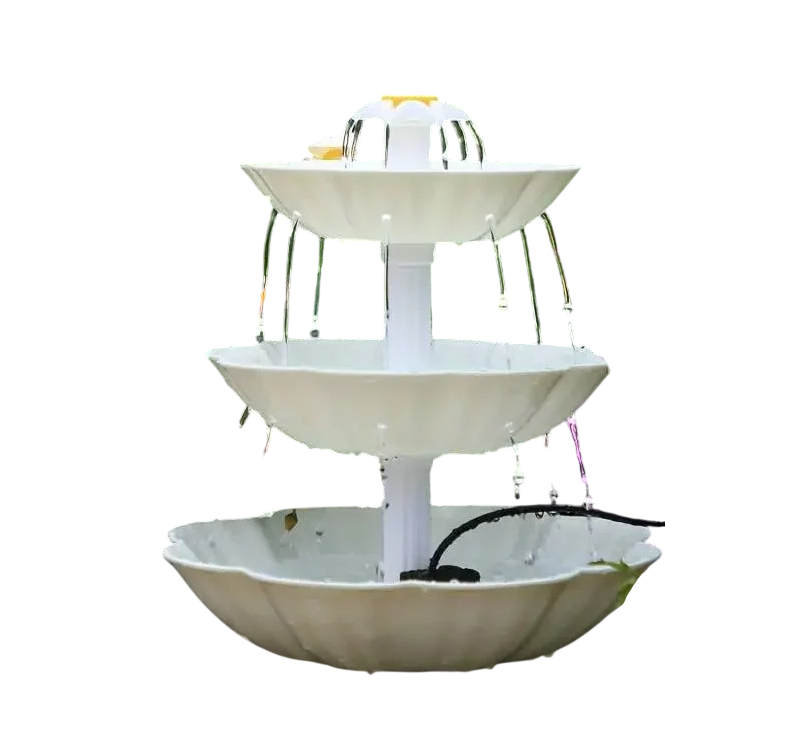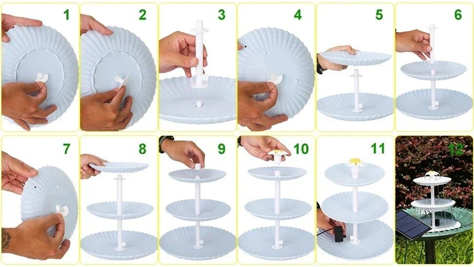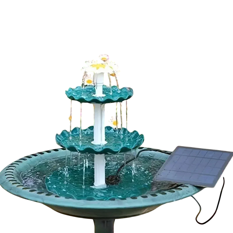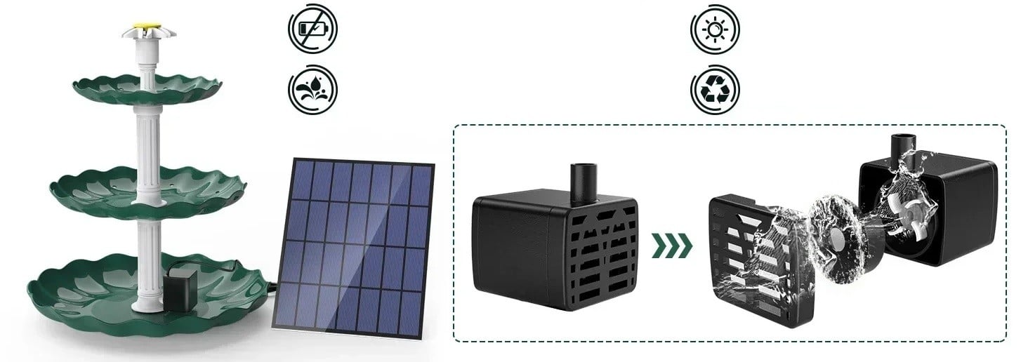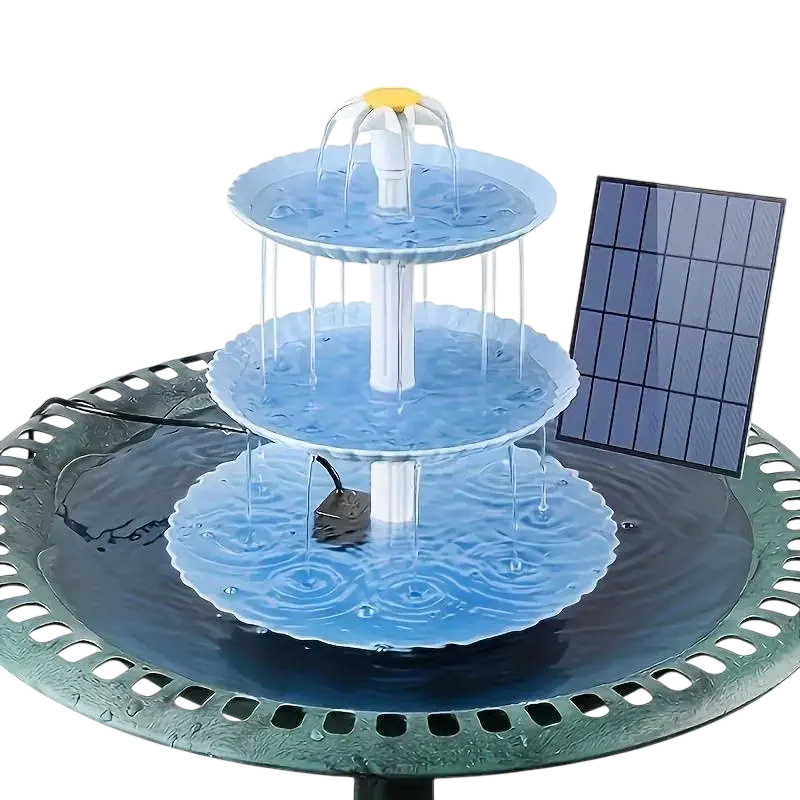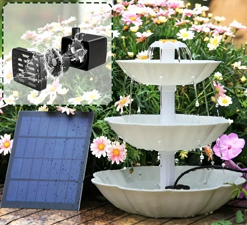 Součástí systému je solární panel, který zajišťuje napájení během slunečního svitu. Čerpadlo vytváří nepřetržitý proud vody, který může přispět k lepší cirkulaci v nádobě. Fontána má vícepatrový design, který rozvádí vodu do několika úrovní. Díky rozebíratelné konstrukci je možné jednotlivé části snadno sestavit nebo rozložit podle potřeby. Celkové provedení je vhodné pro venkovní použití v zahradě.