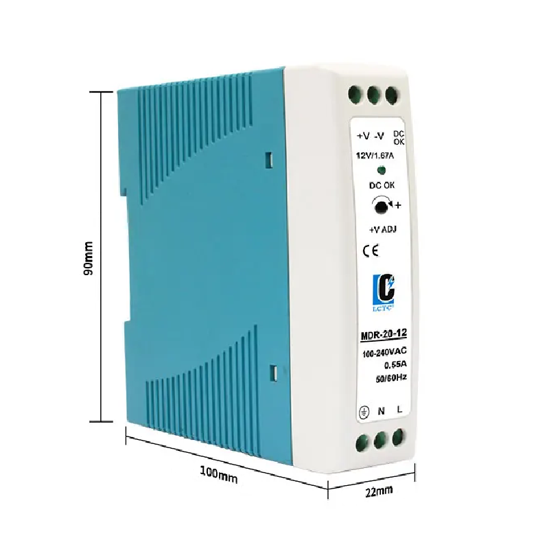 Kompaktní spínaný zdroj na DIN lištu s výkonem 20W, stabilním výstupem DC 12V a ochranou proti přetížení, ideální pro průmyslové použití. Celý popis