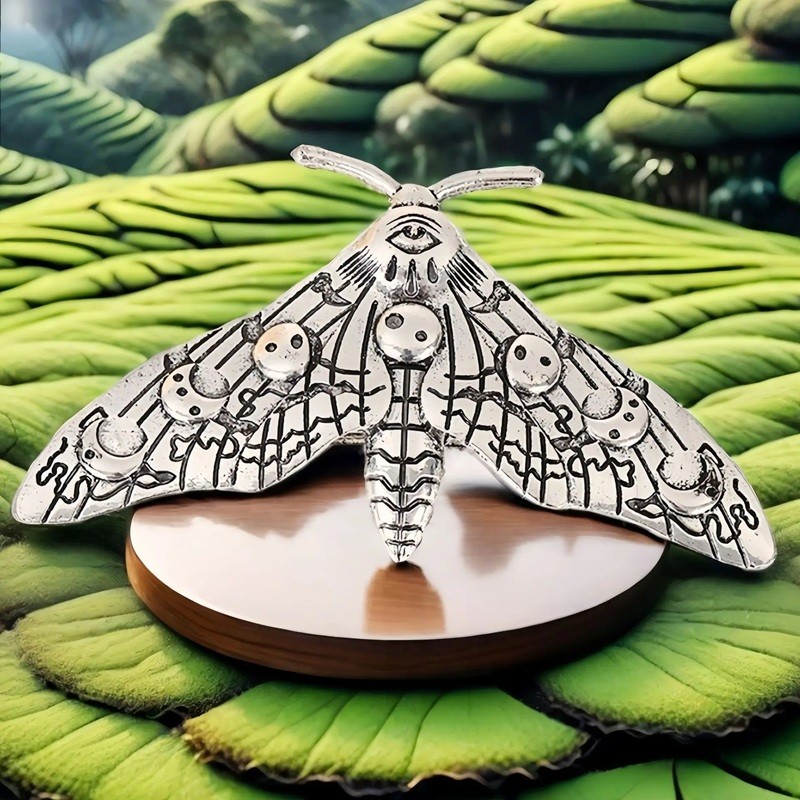 Elegantní sponka do vlasů ve tvaru můry je zdobena jemným motivem fází měsíce, který dodává celému designu symbolický a mystický rozměr. Detailní zpracování křídel s lunárními prvky působí harmonicky a vyváženě. Kovové provedení podtrhuje preciznost detailů a zajišťuje pevnost i dlouhou životnost. Motiv můry v kombinaci s měsíčními cykly vytváří originální a výrazný doplněk.