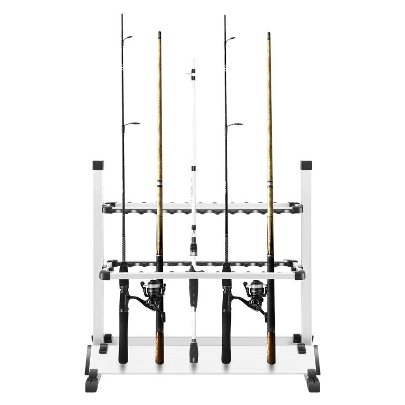 Stojan na rybářské pruty 24 slotů 71,5×31×70 cm hliníková slitina vícepatrový bílý držák prutů pro skladování a rybaření