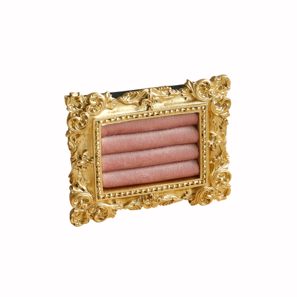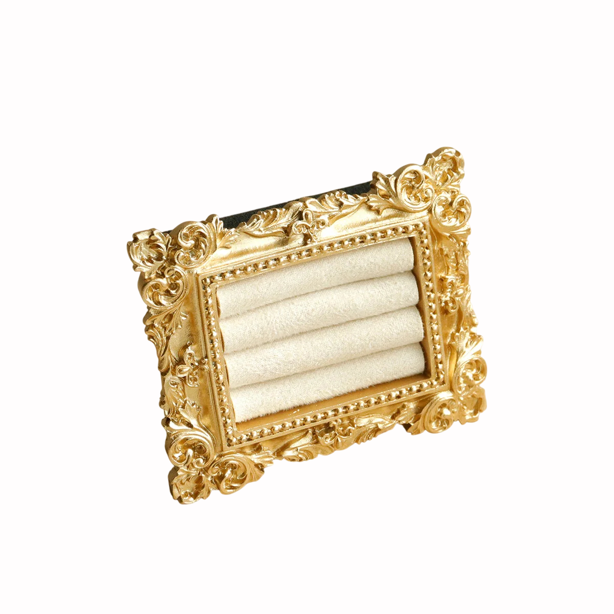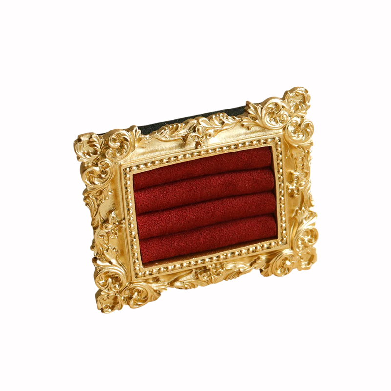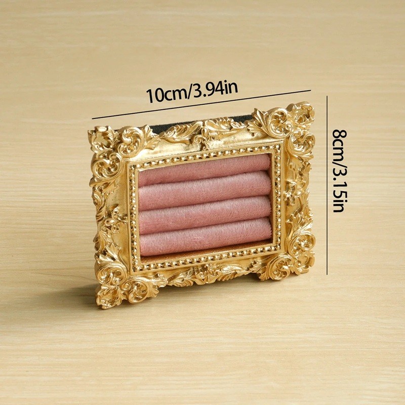 Stojánek na prstýnky s rámečkem 10×8 cm pryskyřice a samet držák se 4 polštářky ve zlaté barvě rámu s opěrkou na vystavení