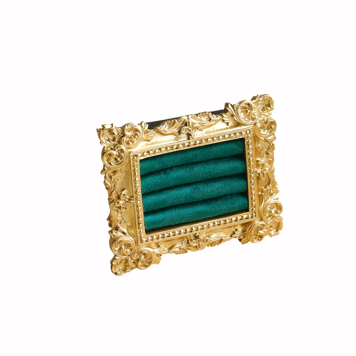 Držák na prstýnky ve formě dekorativního rámečku slouží pro přehledné uložení i vystavení šperků. Kompaktní provedení se hodí na komodu, noční stolek nebo toaletní stolek. Vnitřní část obsahuje polštářky, do kterých lze prstýnky jednoduše zasunout. Zadní opěrka umožňuje stabilní postavení.
