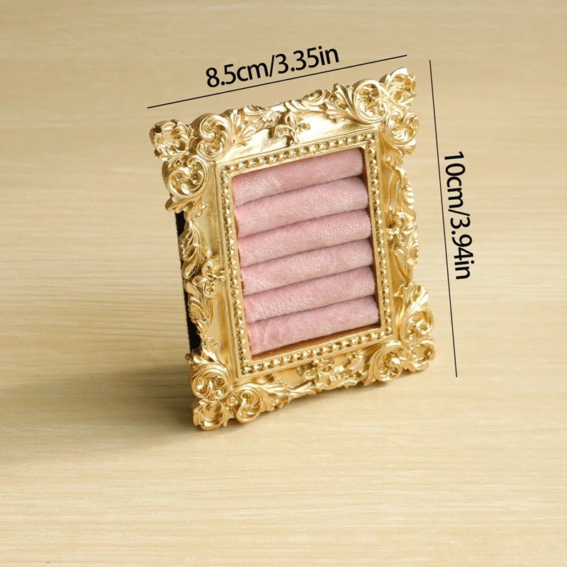 Stojánek na prstýnky s rámečkem 8,5×10 cm pryskyřice a samet držák se 6 polštářky ve zlaté barvě rámu s opěrkou na vystavení