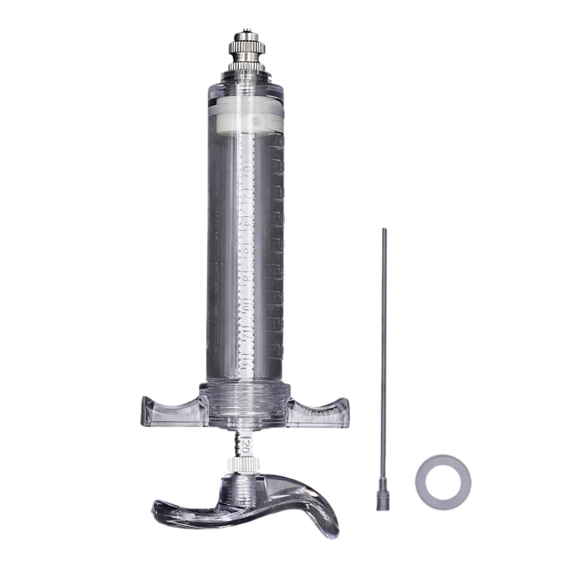 Objem činí 50 ml, což umožňuje podávat větší množství potravy najednou bez nutnosti častého doplňování. Tělo stříkačky je vyrobeno z plastového materiálu, který je lehký a dobře se drží v ruce. Transparentní provedení umožňuje průběžně sledovat množství podávané potravy, což usnadňuje přesné dávkování. Na těle je viditelná stupnice, která pomáhá s orientací při krmení.