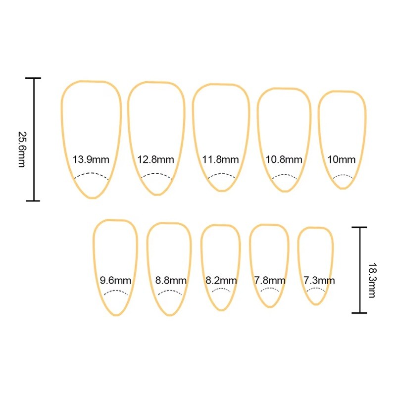• Rozměry 25,6–18,3 mm vhodné pro různé typy nehtů