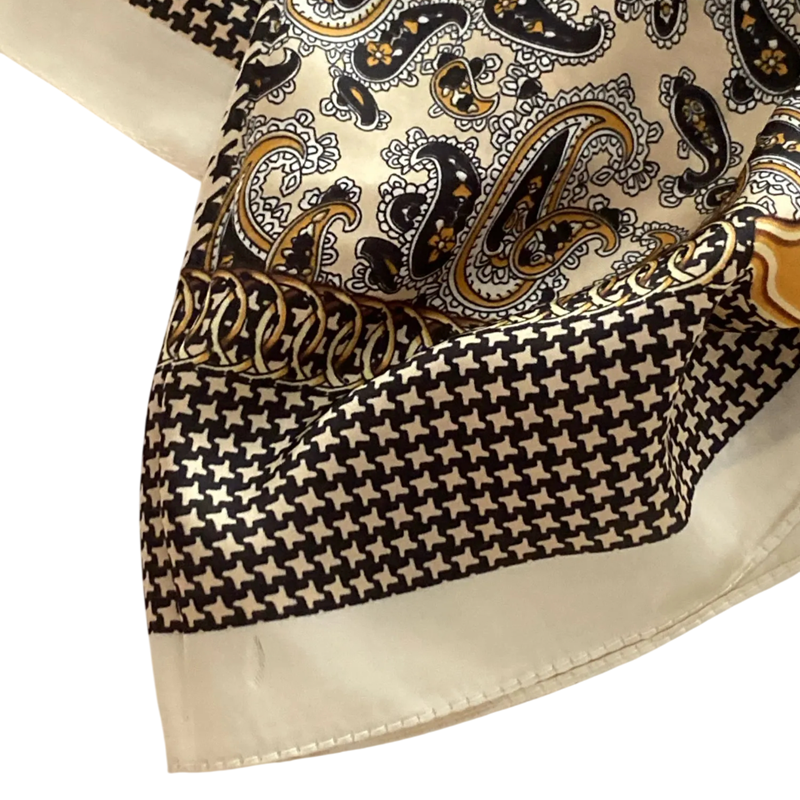 Čtvercový hedvábný šátek představuje nadčasový módní doplněk, který spojuje eleganci, kvalitu a univerzální využití. Díky rozměru 70 x 70 cm je ideální pro různé způsoby nošení – jako šátek na krk, do vlasů nebo jako lehká pokrývka hlavy. Jemný hedvábný materiál působí luxusně, je příjemný na dotek a přirozeně splývá. Klasický paisley kašmírový orientální vzor dodává outfitu sofistikovaný vzhled a zvýrazňuje ženskost.