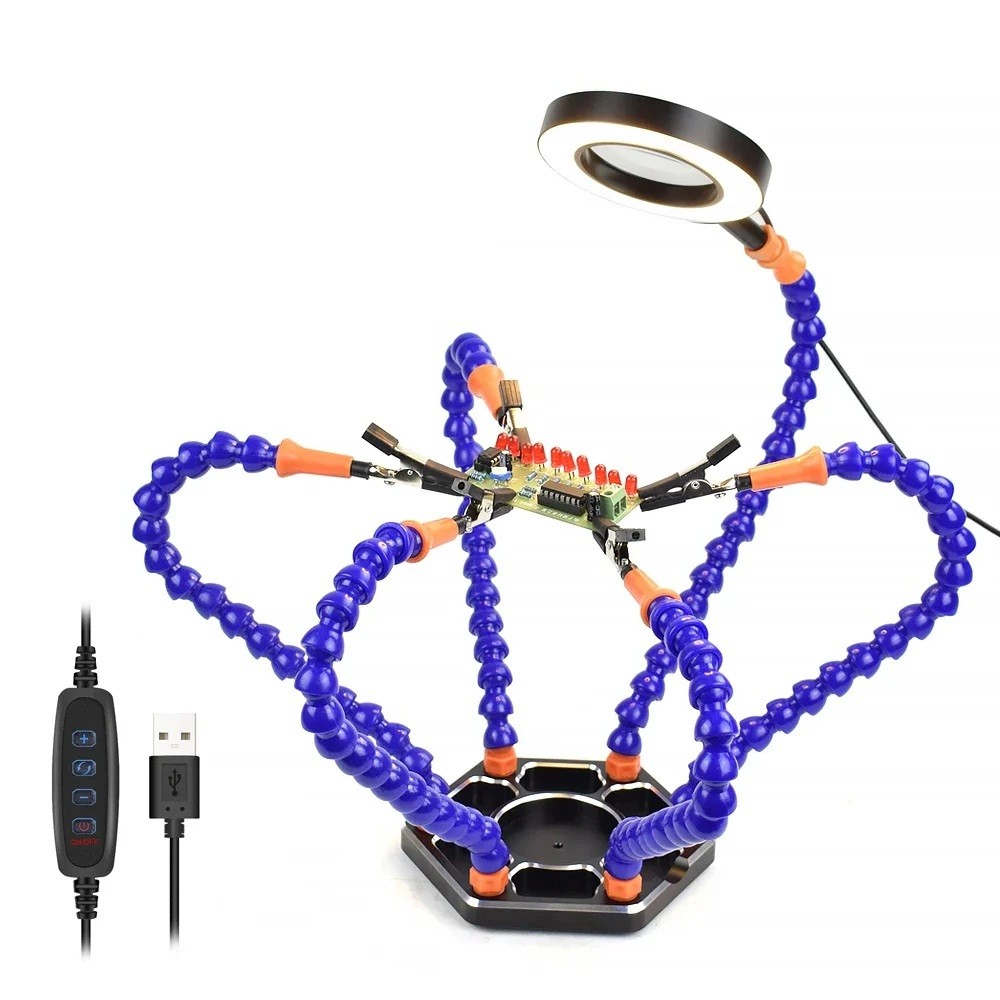 Základna z hliníkové slitiny zajišťuje stabilní oporu při práci. Kloubová ramena v modro oranžovém provedení umožňují široký rozsah nastavení a snadné uchycení součástek. Krokosvorky pevně drží komponenty na místě a zajišťují přesnou manipulaci při pájení. Napájení pomocí USB přispívá k jednoduchému používání bez složité instalace.