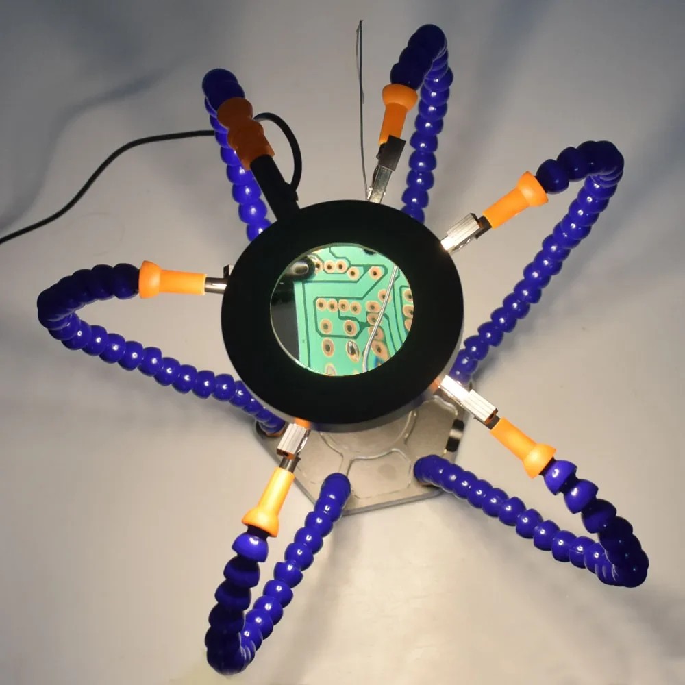 Pájecí stanice s 3× LED lupou, flexibilními rameny a barevnými držáky pro přesnou práci s elektronikou a stabilní základnou. Celý popis