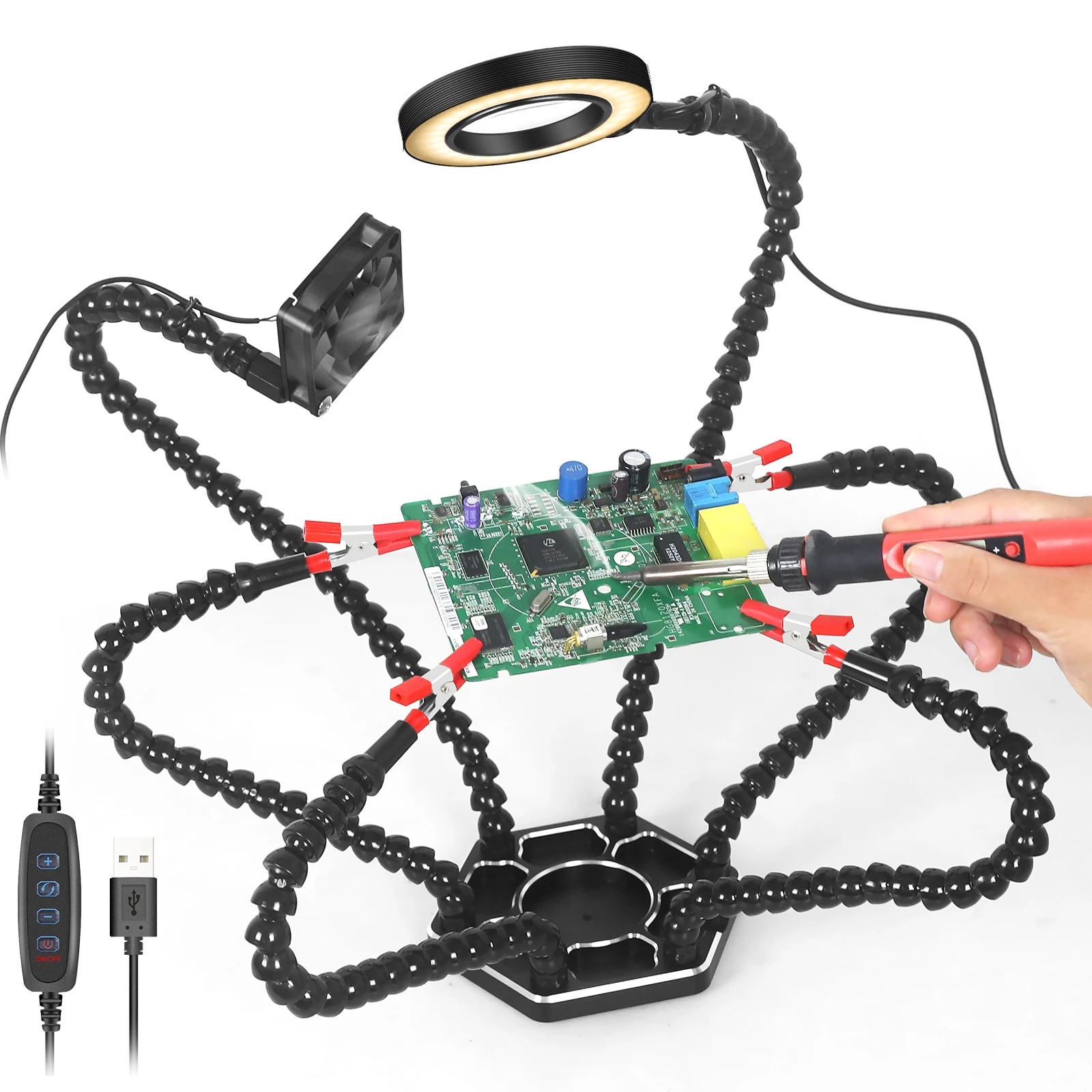 Tato opravná stanice je vhodná pro práci v dílně i domácím prostředí. Kombinace lupy, ventilátoru a držáků usnadňuje práci s malými komponenty. Červené svorky zlepšují viditelnost uchycených dílů a přispívají k lepší orientaci při pájení. Nastavitelná ramena umožňují přesné nastavení pracovní pozice. Stabilní konstrukce zajišťuje pohodlné a bezpečné používání při každodenní práci.
