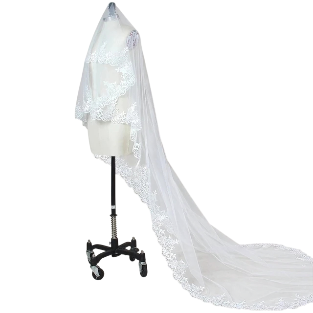 Svatební závoj 3 m Katedrální Jednovrstvý Tylový S hřebínkem Krajkový lem Luxusní dlouhý závoj Bílý Ivory bílá