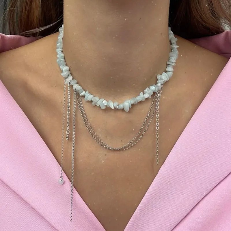 Světle šedý náhrdelník z nepravidelných kamínků s vrstvenými řetízky a drobnými detaily, působí jemně, přirozeně a elegantně. Celý popis