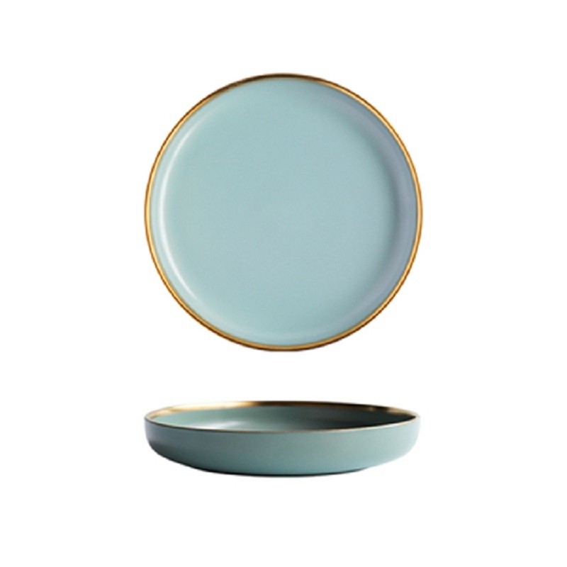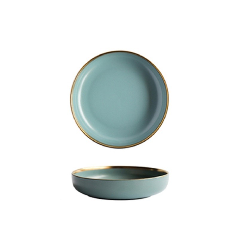 Talíř v pastelových barvách se zlatou linkou.