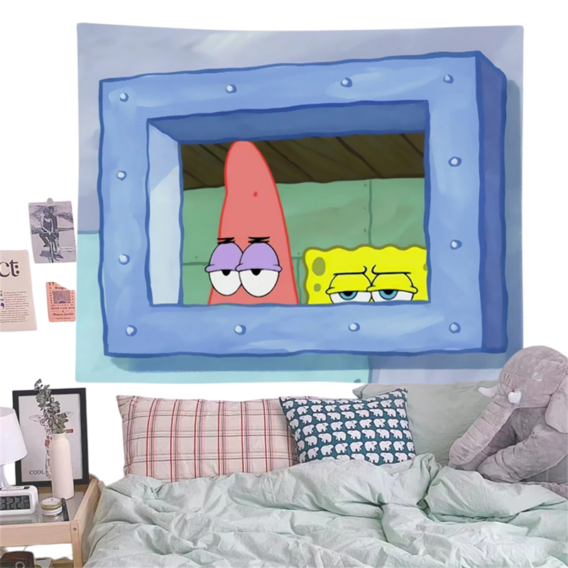 Tapiserie na zeď SpongeBob a Patrik Hvězdice 60 x 90 cm Kreslená dekorace Dětský pokoj Ložnice Estetická látka Závěsný gobelín