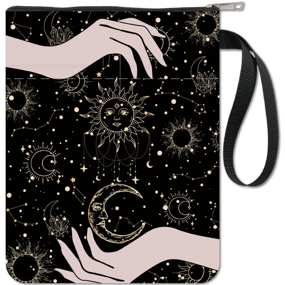 Design tvoří výrazný tmavý podklad doplněný astrologickými a vesmírnými motivy. Na ploše jsou zobrazeny měsíce, slunce s tváří, hvězdy, souhvězdí, krystaly a drobné tečkové ornamenty připomínající noční oblohu. Dominantním prvkem jsou stylizované ruce směřující k měsíci, které vytvářejí tajemný a dekorativní vzhled. Kombinace světlých linií na černém podkladu působí elegantně a kontrastně.