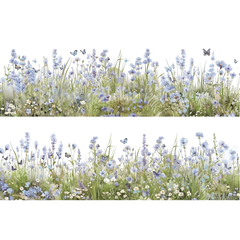 Trávníková páska s jemným motivem modrých květin a trav je vhodná pro dekorování rostlin, květináčů i kreativní projekty. Na obrázku je viditelný akvarelový vzor s modrými květy, travinami, drobnými kvítky a motýly v přírodním stylu. Rozměr 5 cm x 2 m poskytuje dostatečnou délku pro více použití doma i při tvoření. Materiál PET působí hladce a je vhodný pro dekorativní využití. Barevné ladění v modrých a zelených tónech vytváří svěží botanický vzhled.