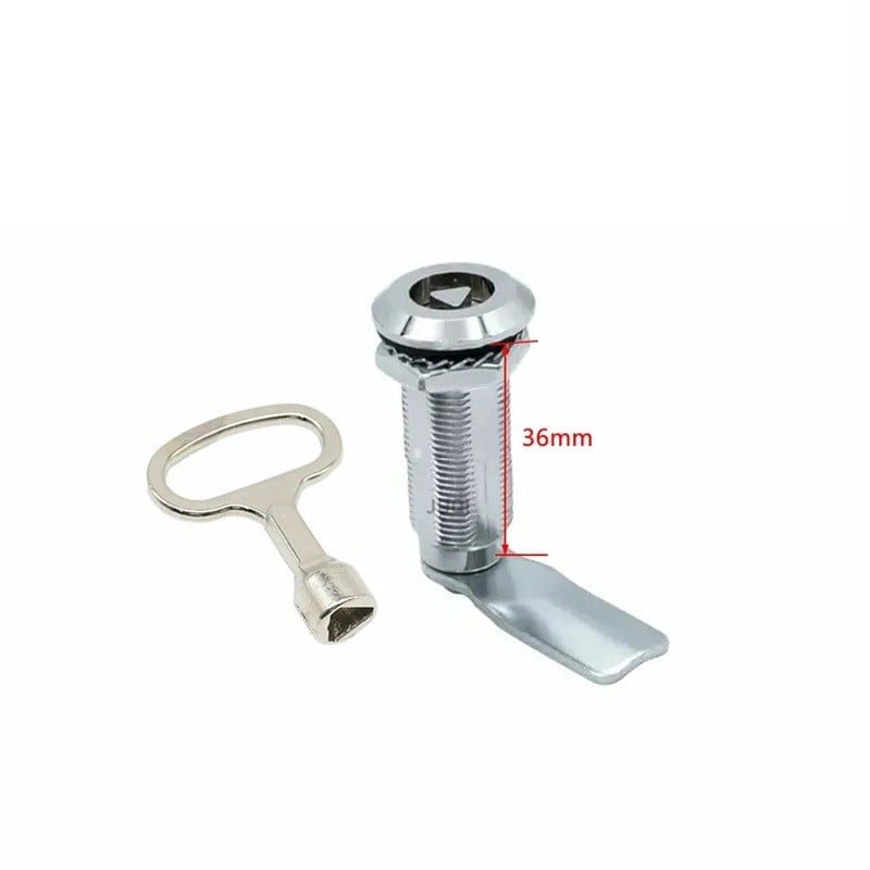 Trojhranný zámek na skříňky a dveře je určen pro jednoduché mechanické uzamykání nábytku, dvířek nebo různých úložných prostor. Tento typ je proveden jako cylindrický zámek s otočným jazýčkem, který po otočení klíče zajistí uzavřený prostor proti otevření. Díky prodlouženému tělu s délkou 36 mm je vhodný pro použití tam, kde je potřeba větší montážní hloubka. Konstrukce odpovídá běžným nábytkovým zámkům používaným ve skříňkách nebo boxech. Na fotografii je dobře patrný také trojhranný profil vložky, který odpovídá tvaru přiloženého klíče.