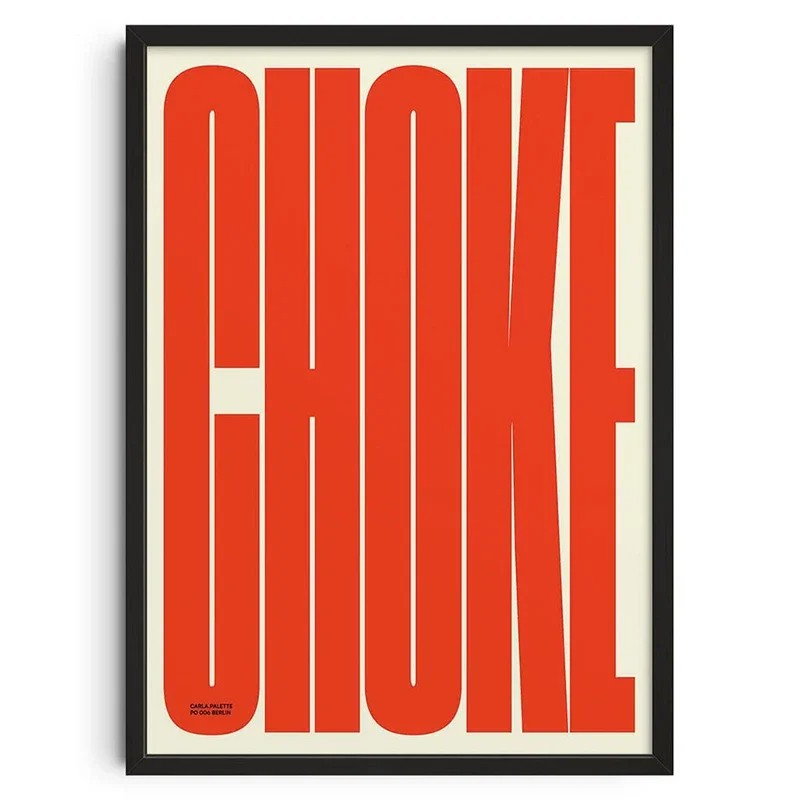 Plakát na zeď s výrazným textovým motivem představuje jednoduchý způsob, jak doplnit interiér o grafický prvek. Dominantou je červený nápis „choke“, který vyplňuje většinu plochy a vytváří silný kontrast vůči světlému pozadí. Díky tomuto řešení je motiv snadno čitelný a vizuálně výrazný.