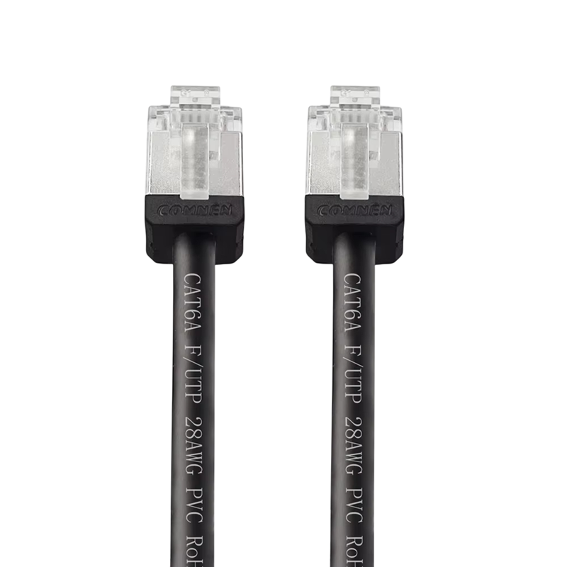 Úsporně vedený Cat6a RJ45 ethernet kabel 2 m slim profil 28AWG FTP PVC 10Gb/s 500MHz černý pro router switch zařízení