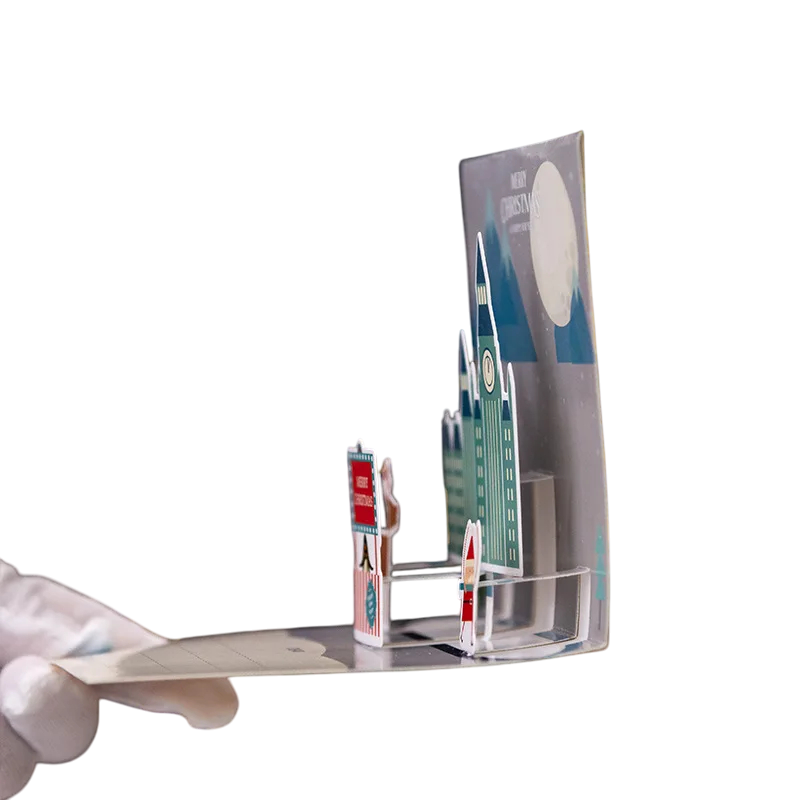 Každé otevření tohoto přání přináší radost, překvapení a kouzlo Vánoc. Třírozměrná konstrukce zajišťuje, že přání působí výjimečně a zaujme na první pohled. Odolný papírový materiál poskytuje dlouhou životnost, zatímco ručně vyráběné detaily mu dodávají osobní nádech. Díky všestrannému designu se hodí do každé domácnosti i kanceláře.