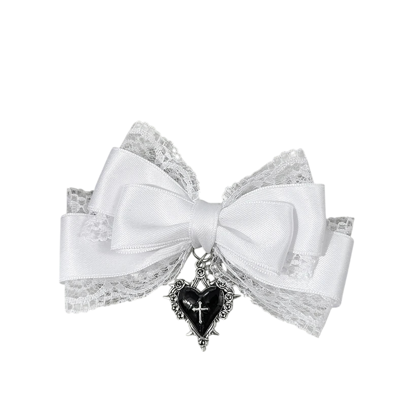 Výrazná vlasová mašle o velikosti přibližně 15 cm je stylovým doplňkem pro slavnostní i tematické účesy. Kombinuje pevnou látku s jemnou krajkou, která vytváří kontrastní a dekorativní efekt. Dominantním prvkem je kovový přívěsek ve tvaru srdce s detailním zdobením, jenž dodává celku osobitý charakter. Díky pevné kovové sponě drží mašle spolehlivě ve vlasech a umožňuje snadné upevnění.