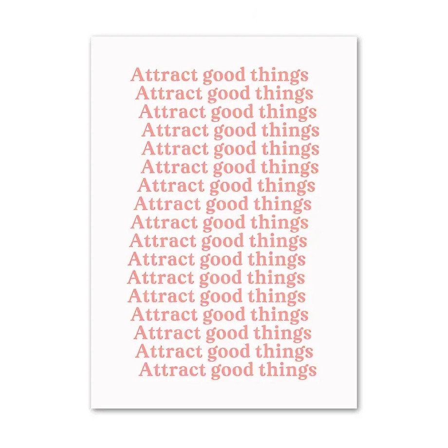 Velkoformátový plakát na zeď s opakovaným nápisem Attract Good Things 50 x 70 cm tisk na plátno růžový typografický design bez rámu dekorace interiéru