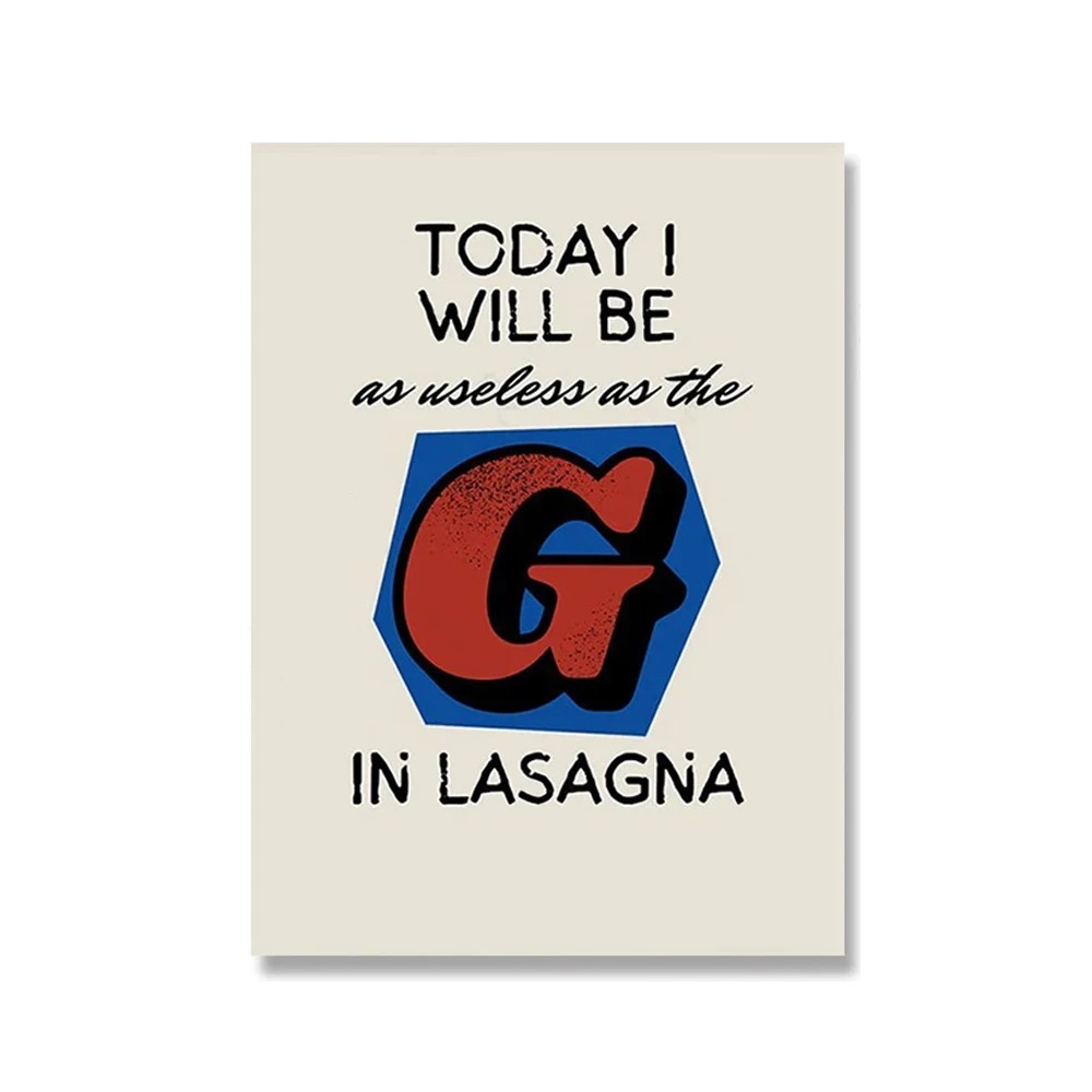 Velkoformátový plakát s vtipným lasagnovým nápisem je dekorací, která doplní interiér o výrazný textový motiv inspirovaný gastronomií. Grafika kombinuje nápis s výrazným písmenem a barevným podkladem, čímž vzniká jednoduchý a dobře čitelný vizuální celek. Text „Today I will be as useless as the G in lasagna“ tvoří hlavní prvek designu a dodává plakátu charakteristický vzhled. Díky rozměru 50 × 70 cm je plakát dobře viditelný i z větší vzdálenosti a může sloužit jako dominantní dekorace na stěně.