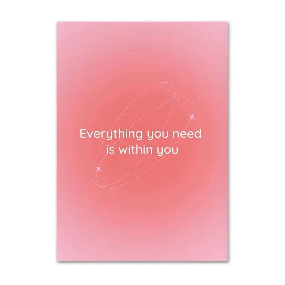 Plakát 50 × 70 cm s citátem Everything You Need Is Within You. Růžové gradientní pozadí, plátěný tisk bez rámu na stěnu. Celý popis