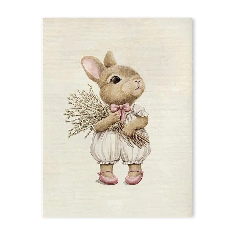 Velký plakát na zeď s ilustrací králíčka 50 x 70 cm tisk na plátno béžovo-růžové jemné tóny bez rámu dekorace do dětského pokoje