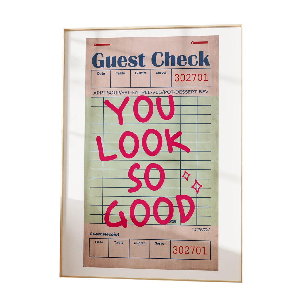 Plakát je vyroben technologií tisku na plátno, která mu dodává charakteristickou strukturu. Díky tomu nepůsobí ploše a lépe zapadne mezi ostatní dekorace. Jedná se o měkký plakát, který je lehký a snadno se instaluje. Velký formát 50 × 70 cm umožňuje využití jako dominantního prvku na stěně. Hlavním prvkem je růžový pochvalný nápis „You Look So Good”, který je dobře čitelný i z větší vzdálenosti. Produkt je dodáván bez rámu, což umožňuje zvolit vlastní způsob uchycení.
