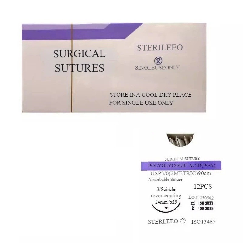 Veterinární vstřebatelné stehy PGA USP 3-0 90 cm 3/8 kruhová reverzní řezná jehla 24 mm sterilní jednorázové chirurgické šití