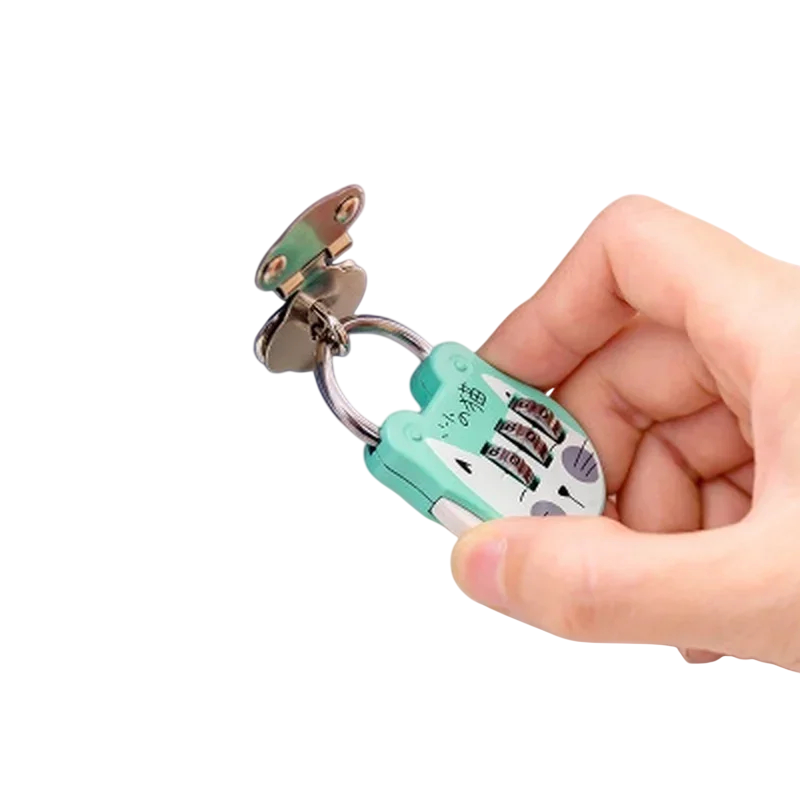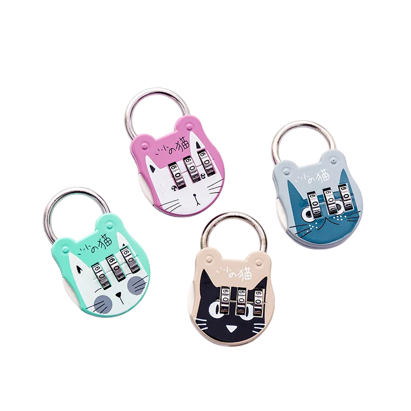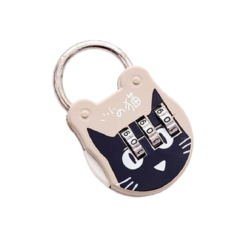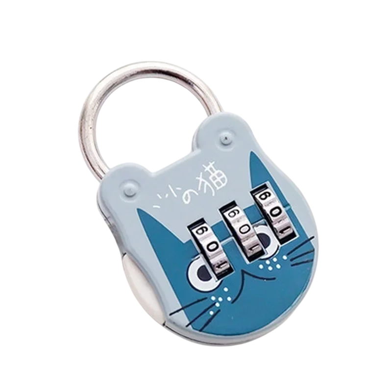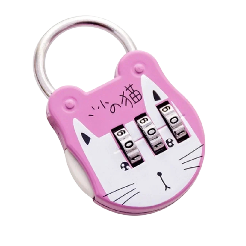 Malý visací zámek s číselným kódem a motivem kočky. Vhodný pro batohy, kufry nebo skříňky, snadné nastavení a kompaktní rozměry. Celý popis