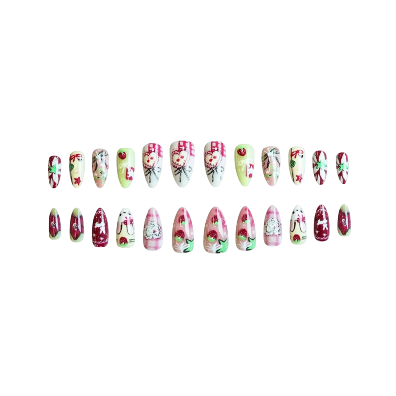 Tento vizuální manikúrní efekt je ideálním řešením pro každého, kdo chce mít upravené nehty bez složité a časově náročné péče. V balení se nachází 24 kusů falešných nehtů s lesklým povrchem, které jsou doplněny o jemné a roztomilé vzory vhodné pro každodenní nošení i speciální příležitosti. Díky 12 různým velikostem v rozmezí od 25,6 mm do 18,3 mm si snadno vybereš ideální rozměr pro každý prst. Mandlový tvar dodává rukám elegantní vzhled a opticky prodlužuje prsty. Nehty lze jednoduše zastřihnout a zapilovat do libovolné délky a tvaru.