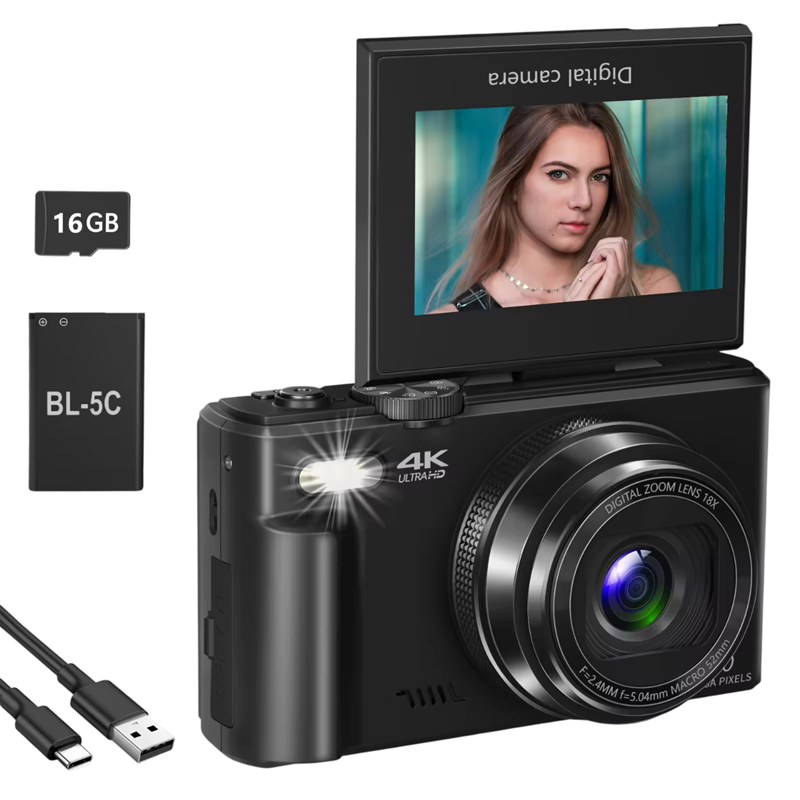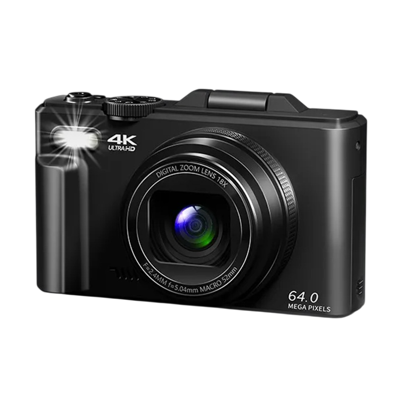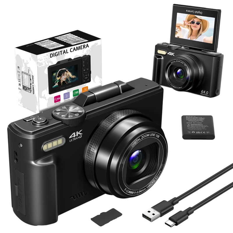 Vlogovací kamera 64 MP UHD 4K 18× zoom Výklopný LCD 180° WiFi Webkamera Autofokus Fotoaparát s SD kartou 16 GB