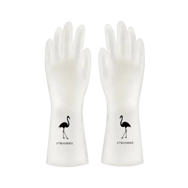 Silikonové rukavice na čištění domácnosti jsou praktickým pomocníkem při každodenních úklidových činnostech. Jsou vhodné pro mytí nádobí, čištění kuchyně i práci v prádelně, kde je potřeba chránit ruce před vodou a nečistotami. Voděodolné provedení umožňuje pohodlné použití při práci s vodou. Bílé provedení doplněné motivem plameňáka je dobře rozpoznatelné a odlišuje rukavice od běžných modelů.