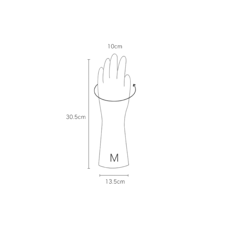 Materiál ze silikonu je pružný a přizpůsobí se tvaru ruky, což zajišťuje pohodlí při používání. Velikost M je určena pro středně velkou ruku a poskytuje dostatek prostoru pro komfortní nošení. Díky délce přibližně 30,5 cm rukavice chrání nejen dlaně, ale i část předloktí. Uvedené rozměry pomáhají s výběrem správné velikosti pro konkrétní použití.