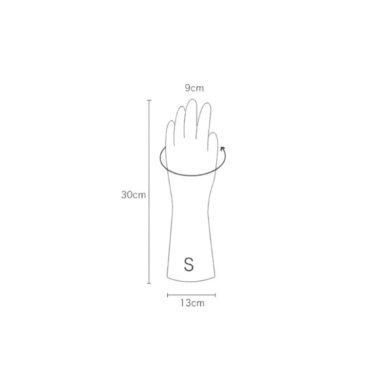 Rukavice jsou vyrobeny ze silikonu, který je pružný a přizpůsobí se tvaru ruky. Velikost S je určena pro menší ruku a zajišťuje pohodlné nošení při práci. Díky délce přibližně 30 cm poskytují ochranu nejen dlaním, ale i části předloktí. Uvedené rozměry pomáhají vybrat správnou velikost podle potřeby.