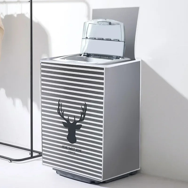 Tento ochranný potah na vrchem plněnou pračku o rozměrech 86 x 62 x 55 cm je navržen tak, aby poskytoval spolehlivou ochranu před prachem, vlhkostí, slunečním zářením i nečistotami. Přední část zdobí moderní pruhovaný motiv s elegantní siluetou jelena, který dodá pračce stylový vzhled a skvěle zapadne do koupelny, prádelny nebo technické místnosti. Voděodolný povrch z pevného materiálu PEVA (100 % polyester) chrání povrch spotřebiče před deštěm, stříkající vodou a přirozeným opotřebením, což prodlužuje jeho životnost.