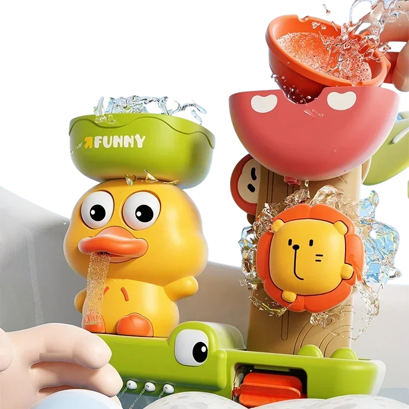 Tato vodní sada s kachničkou promění běžné koupání v oblíbenou a kreativní aktivitu. Děti mohou nalévat vodu různými způsoby a sledovat, jak se mění průtok, pohyb i zvuková stránka tekoucí vody. Zaujme je rotující lvíček, průtok skrz zobák, proudy stékající z krokodýlí části nebo přelévání přes horní nálevku. Díky promyšlené konstrukci je hračka stabilní a dobře drží na hladkých površích. Stane se tak výborným společníkem, který rozveselí každý dětský koupelový rituál a nabídne spoustu zábavy i během letních vodních her.