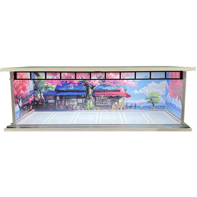Výstavní dioráma garáž pro modely aut 30 x 13,5 x 10 cm 1:64 Japonská ulička se sakurami Parkoviště pro sběratelské modely aut
