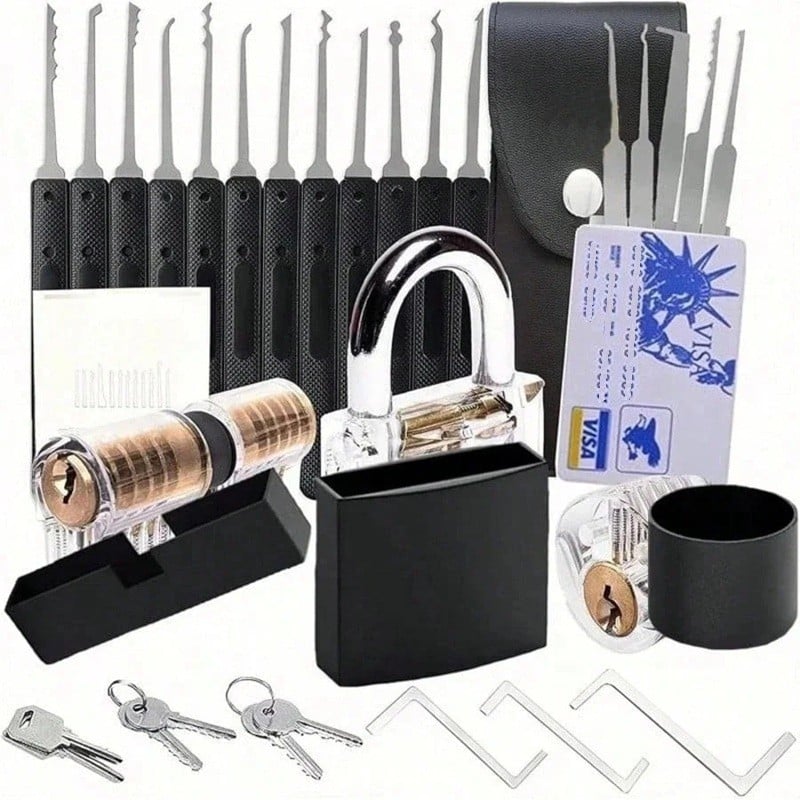 Součástí balení je také tréninkový zámek, který umožňuje lepší pochopení vnitřního mechanismu. Transparentní provedení umožňuje sledovat pohyb jednotlivých částí během manipulace. Praktické pouzdro pak zajišťuje přehledné uložení všech nástrojů.