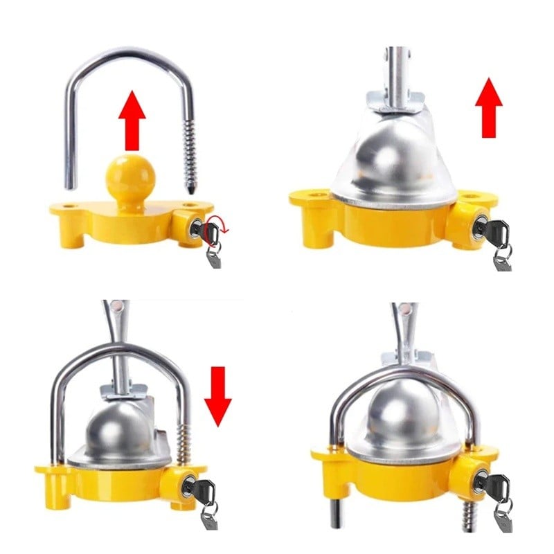 Zámek na tažné zařízení je praktickým doplňkem pro zabezpečení přívěsů, karavanů nebo obytných vozů. Díky své konstrukci se nasazuje přímo na kouli tažného zařízení a brání nechtěnému připojení. Na obrázcích je patrné nastavitelné provedení třmenu, které umožňuje přizpůsobení podle konkrétního použití. Uzamykání je řešeno klasickým mechanismem na klíč, což usnadňuje každodenní manipulaci.