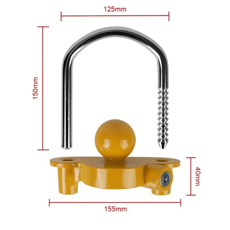 Celkové rozměry produktu jsou 155 × 125 × 150 mm, což odpovídá kompaktnímu provedení vhodnému pro běžné použití. Konstrukce obsahuje pevný obloukový třmen a základnu s kulovým prvkem, který zapadá do spojky přívěsu. Tento typ řešení pomáhá zabránit nasazení přívěsu na tažné zařízení vozidla. Na detailu je vidět také ratchet (ráčnový) systém, který umožňuje nastavení polohy třmenu.