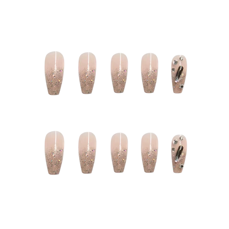Tato sada umělých nehtů je navržena pro maximální vizuální efekt a moderní vzhled. Třpytivý zářivý povrch okamžitě upoutá pozornost a dodá rukám luxusní charakter. Coffin tvar patří mezi nejoblíbenější siluety současné manikúry a ve spojení se střední délkou působí elegantně i prakticky. Akrylový materiál poskytuje realistický vzhled nehtů a příjemný pocit při nošení. Povrch je hladký, lesklý a vizuálně čistý.