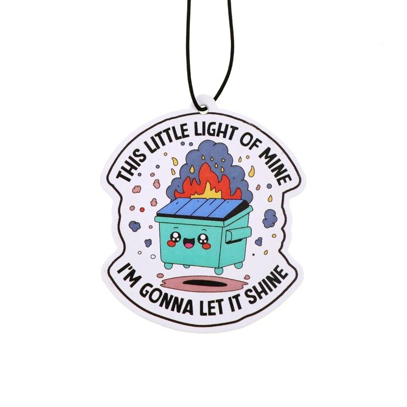 Závěsný osvěžovač vzduchu do auta hořící popelnice nápis this little light of mine voňavý přívěsek barevný dekorace interiéru