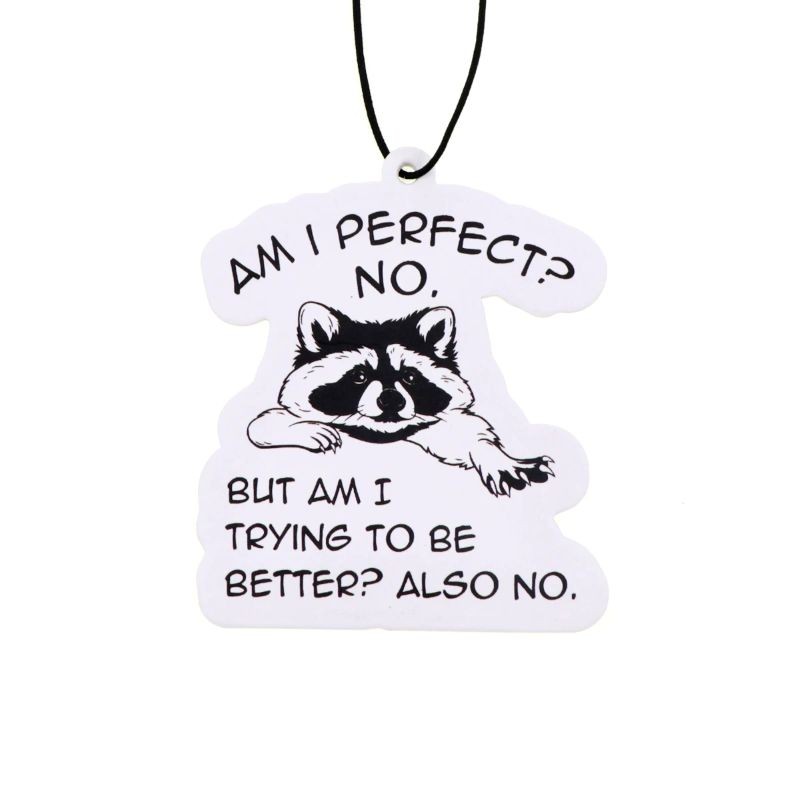 Závěsný osvěžovač vzduchu do auta mýval nápis am i perfect no voňavý přívěsek bílý s černým potiskem dekorace interiéru