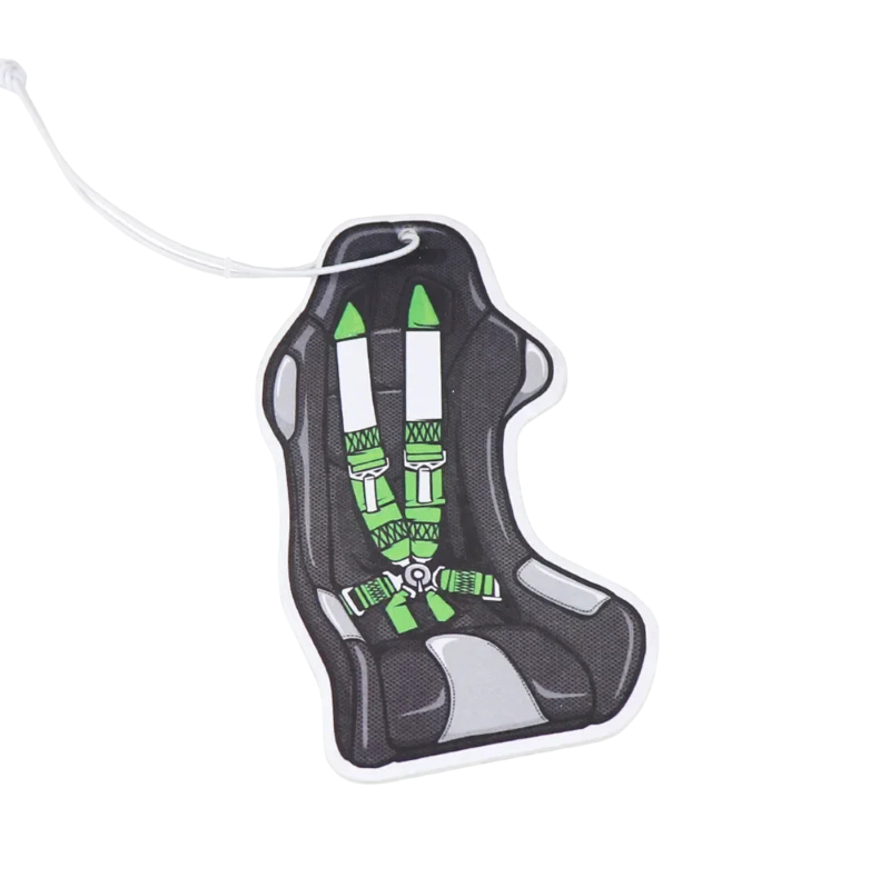Závěsný osvěžovač vzduchu do auta na zpětné zrcátko motiv závodní sedačky 10 × 5 cm pevné provedení černo zelený doplněk interiéru