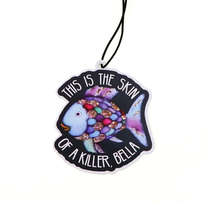 Závěsný osvěžovač vzduchu do auta s motivem barevné ryby představuje praktický doplněk, který zároveň plní i dekorativní funkci. Tento model zaujme především výrazným ilustrativním designem a textem „THIS IS THE SKIN OF A KILLER, BELLA“, který je umístěn po obvodu motivu. Díky tomu se jedná nejen o vůni do auta, ale i o originální vizuální prvek.